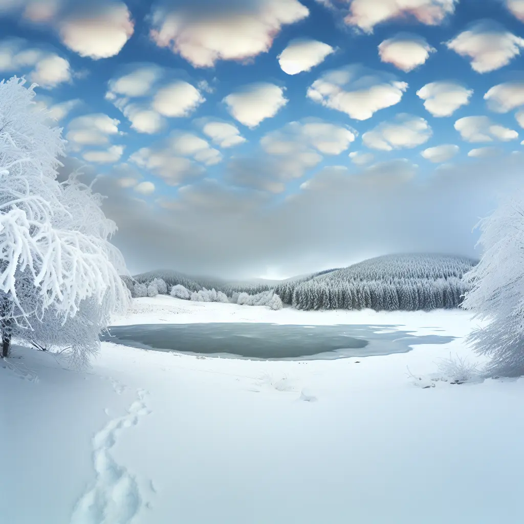 - Замерзла річка/озеро: Дзеркальна поверхня льоду, вкрита візерунками, або ж замерзлі очерети, що стирчать з-під снігу.